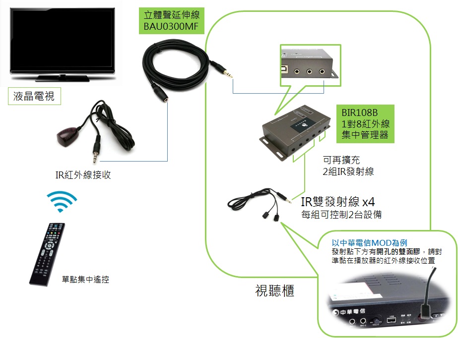 當您有視聽音響設備,像是MOD或機上盒,為了配合更美觀的裝潢而需要集中放於專用櫥櫃中,由於紅外線並不能直接穿透櫥櫃及遮蔽物。所以,當櫥櫃是關閉的時候,就會導致無法以紅外線遙控視聽設備,造成使用上的不便。