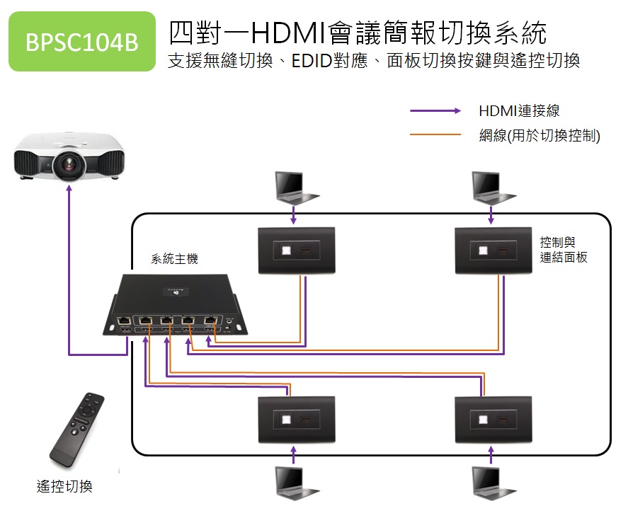 BENEVO四對一HDMI會議簡報切換系統,附4組黑色面板