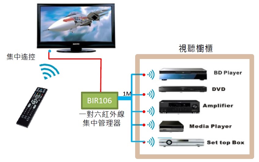當您有視聽音響設備為了配合裝潢而需要集中放於專用櫥櫃中,由於紅外線並不能直接穿透櫥櫃及遮蔽物。所以,當櫥櫃是關閉的時候,就會導致無法以紅外線遙控視聽設備,造成使用上的不方便。